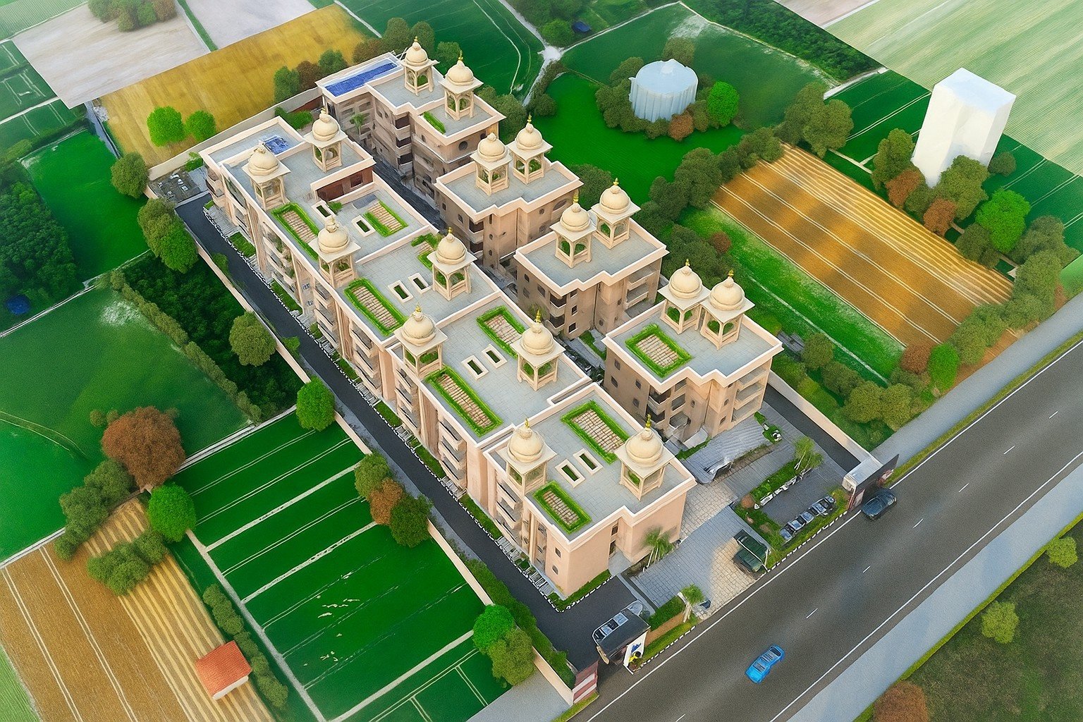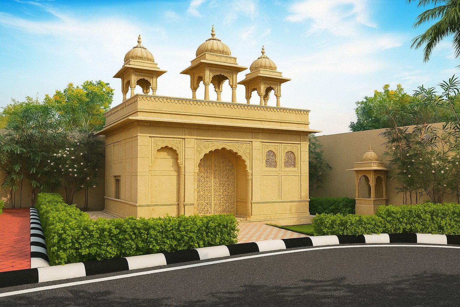 Inspired by the palatial charm of Rajasthan’s royal mansions, the project showcases intricate façade detailing, grand entrances, and landscaped courtyards. Every unit is thoughtfully designed to offer a sense of openness while maintaining privacy and exclusivity.